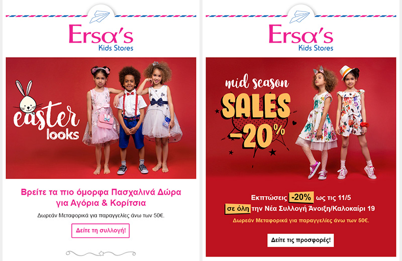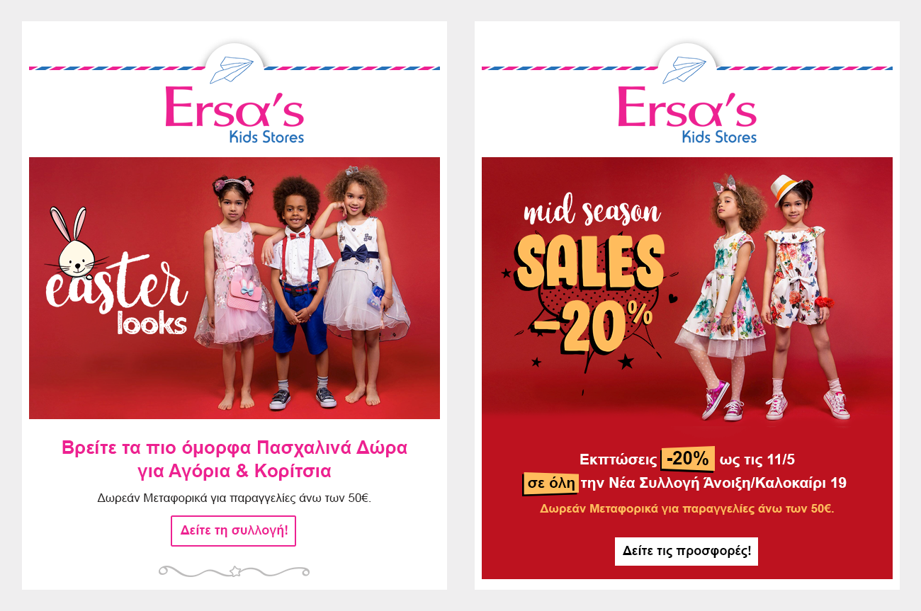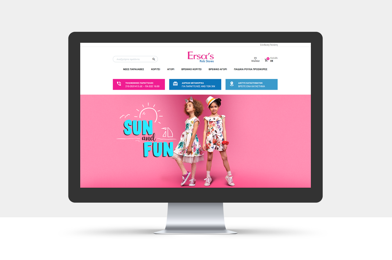 Τα Ersa’s Kids Stores βρίσκονται στο χώρο της παιδικής μόδας από το 1970 παράγοντας παιδικές κάλτσες, εσώρουχα & πυζάμες. Παράλληλα η εταιρία έχει ένα δίκτυο 8 καταστημάτων λιανικής σε Αττική & Καλαμάτα.